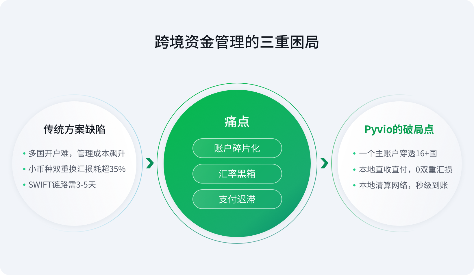 在全球化浪潮中,中国企业出海步伐不断加快,但跨境资金流转的痛点始终如影随形:多国账户切换繁琐、资金周转缓慢、汇兑损耗高昂、合规路径复杂。这些痛点如同无形的枷锁,拖累着企业拓展全球市场的效率与雄心。而Pyvio湃沃构建的全球账户体系正成为出海企业突破资金管理瓶颈的关键基础设施,作为企业跨境资金管理的中枢神经体系,Pyvio湃沃通过一个主账户可以为出海企业一站式开通全球16+国家/地区的本地同名银行账户(如美国、香港、越南、欧盟等),利用深度整合本地清算网络、智能路由引擎与场景化工具的金融操作系统,帮助出海企业破解出海困局。