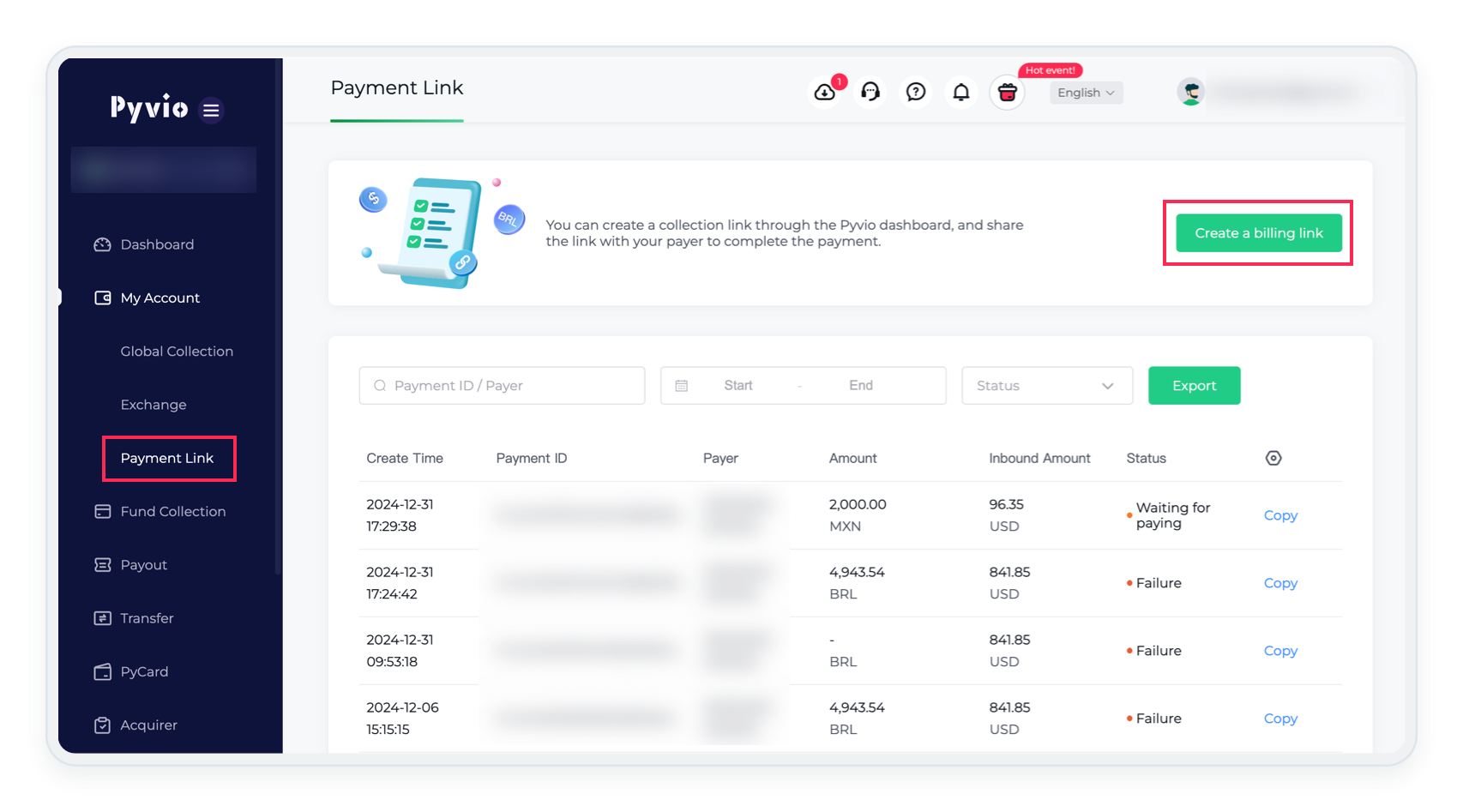 Log in to your Pyvio account, navigate to [My Account] > [Bill Payments], and create a new payment link.