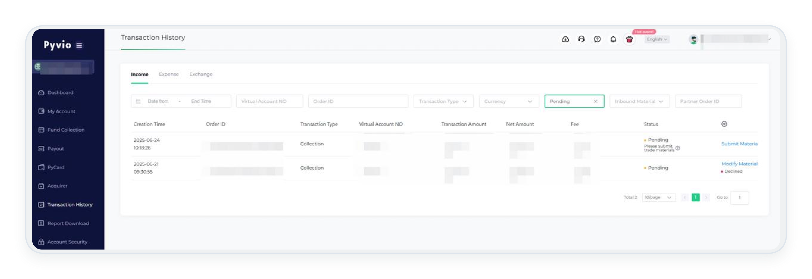 When the withdrawal succeeds, log in to your Pyvio account to check income transactions and filter Status with Pending to summit or modify required Material. Upload corresponding screenshots of the withdrawal from TikTok Shop platform.