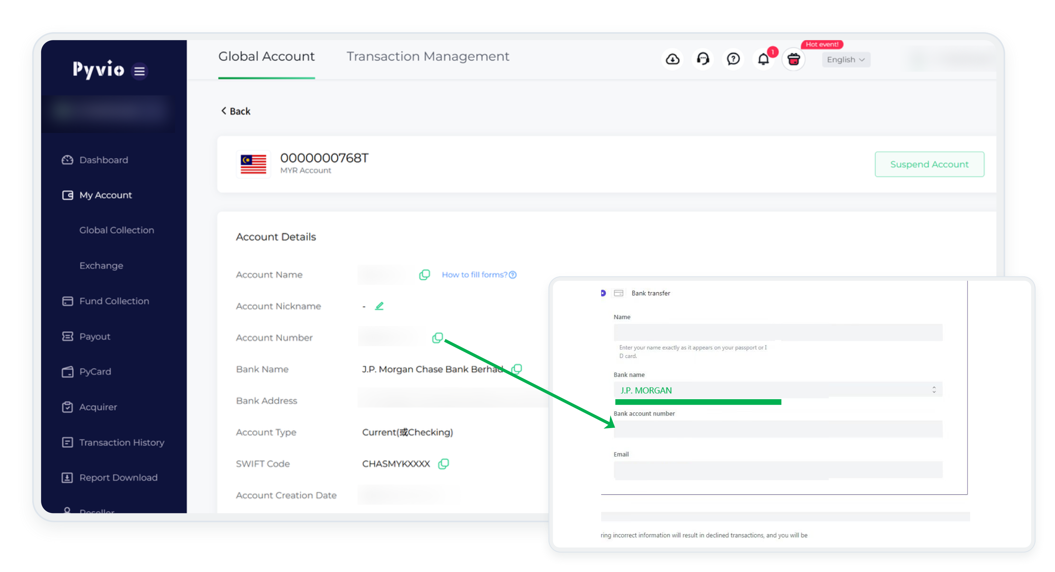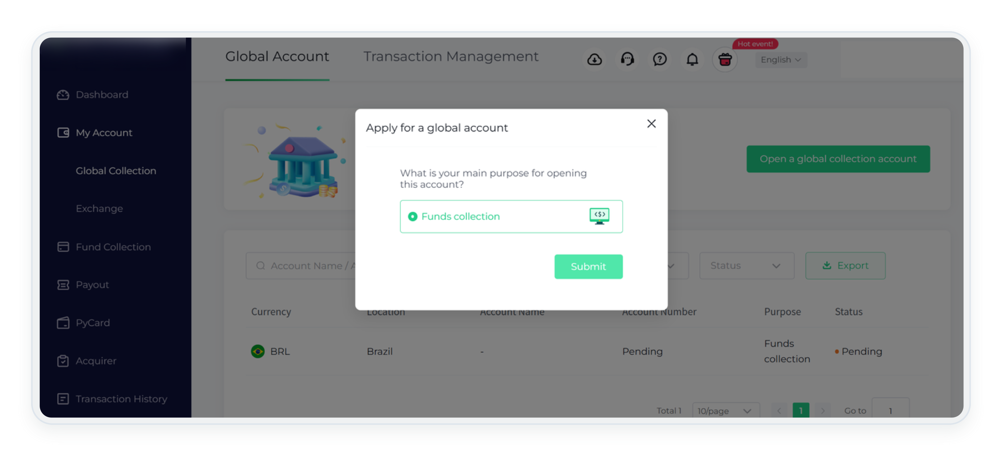 2.1 Click My Account>Open a global collection account, choose Funds collection and click Submit to create a receiving account.