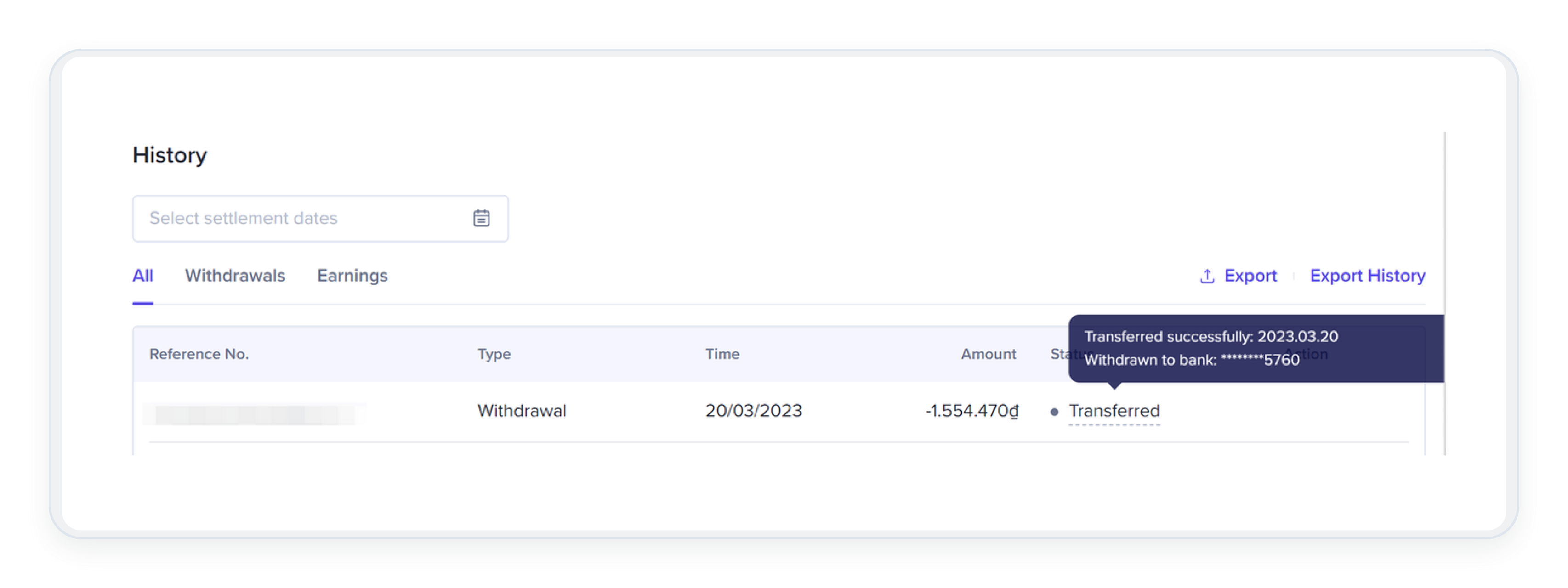 Note: The screenshot image must contain Time, Receiving Account, Amount of the withdrawal. Status Processing indicates that the withdrawal is in process, and status Transferred indicates that the withdrawal succeeds. Hover the mouse over Status Transferred to see the Receiving Account.